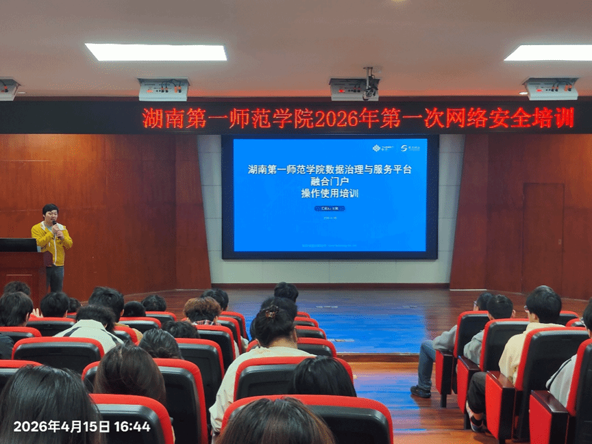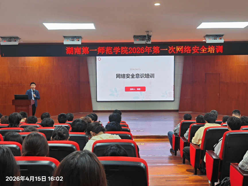 为全面提升全校师生网络安全防护意识与应急处置能力,熟练掌握校园信息系统使用方法,筑牢校园网络安全屏障,4 月 15 日下午,我校 2026 年第一次网络安全培训在特立楼南栋 112顺利举办。本次培训由现代教育技术与网络中心主办,湖南省网安基地科技有限公司、广州联奕科技有限公司协办,各二级单位信息员及学生代表共 130 余人参加。本次培训由现代教育技术与网络中心副主任姜明芳主持。